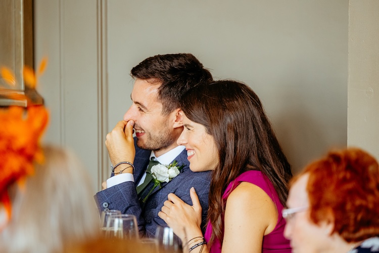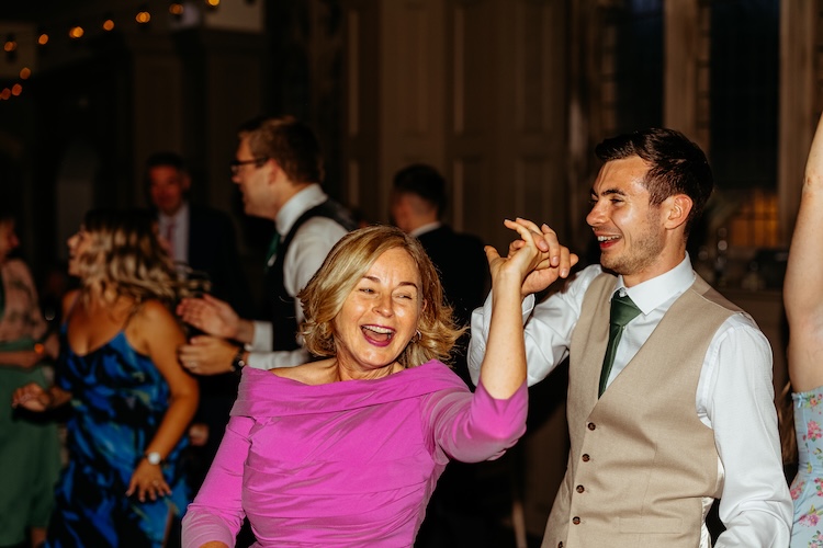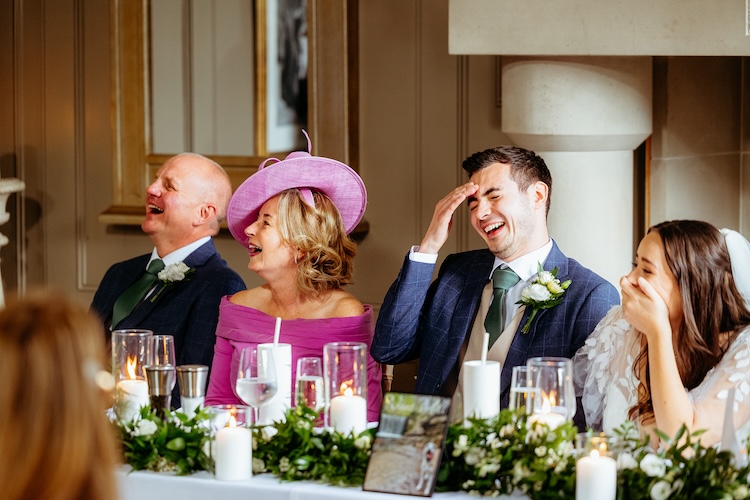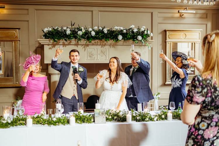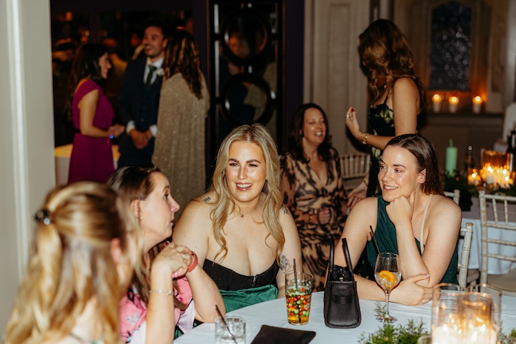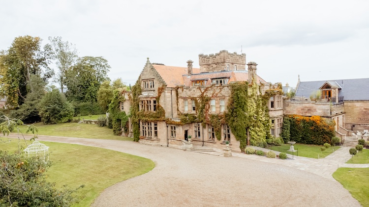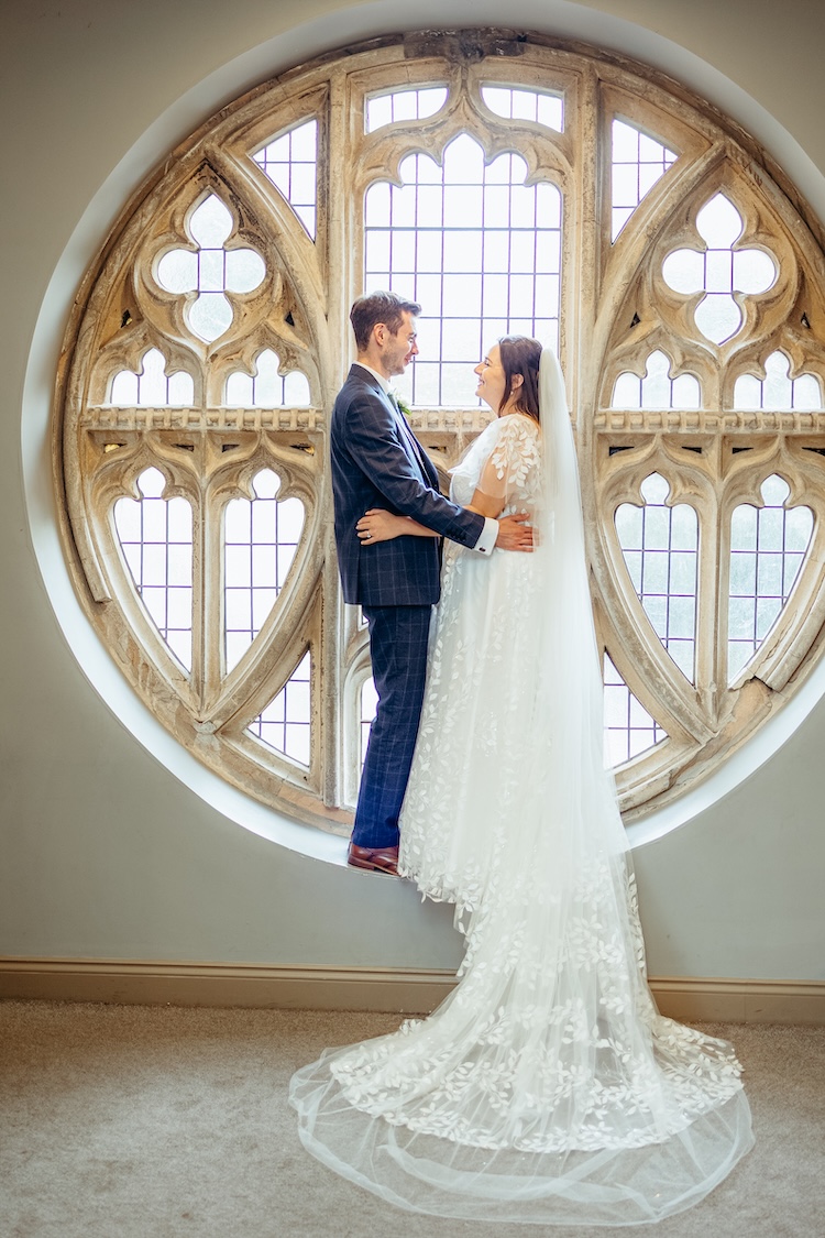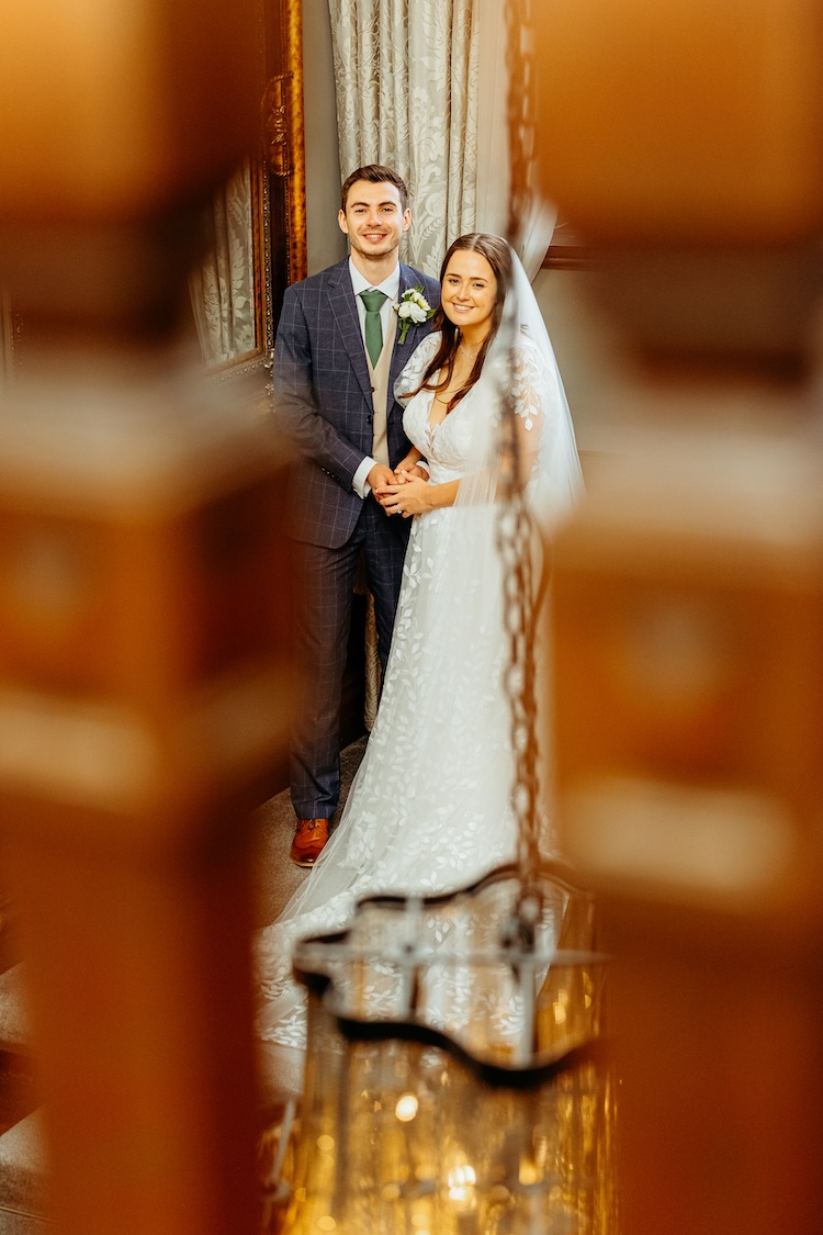 After the ceremony, the celebrations moved outside, where the sun shone on Ellingham Hall’s beautiful gardens. The newlyweds and their families enjoyed relaxed group portraits, capturing smiles and laughter against the Hall’s striking stone backdrop and lush autumn foliage. One of the most memorable moments was Callum and Alice’s romantic portrait in front of the Hall’s iconic round window, a true symbol of their day.