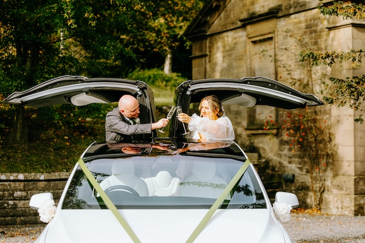 After the ceremony, Emily and Ryan celebrated in style, raising a toast together from the roof of a Tesla – one of the day’s most joyful and unique moments. The hotel’s beautiful gardens and countryside provided endless opportunities for stunning portraits, capturing the love and excitement of the newlyweds.