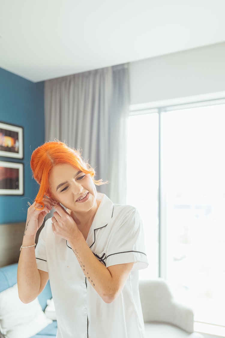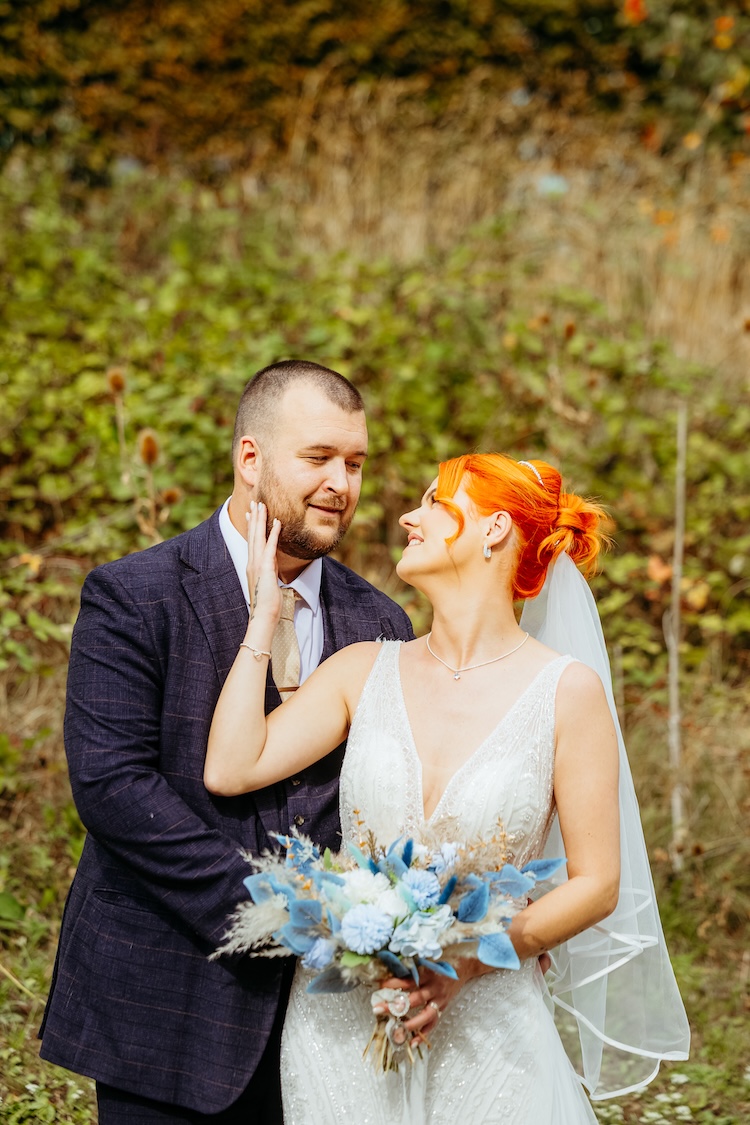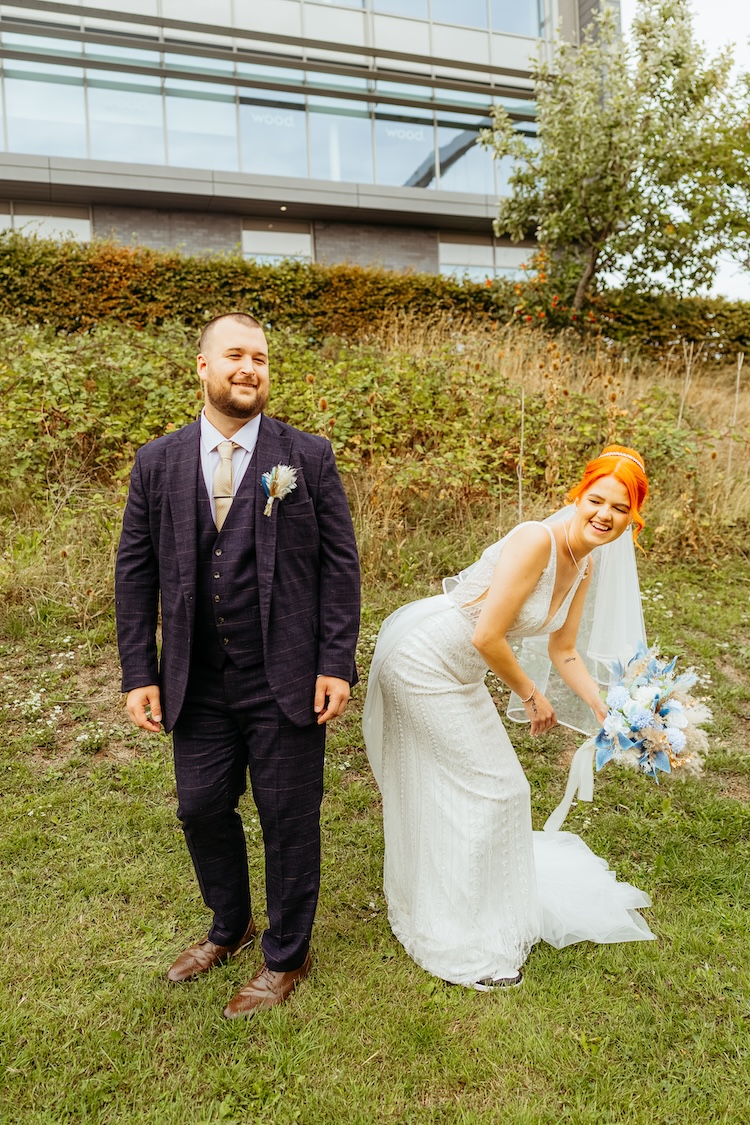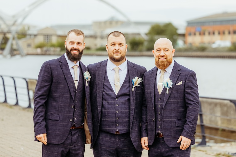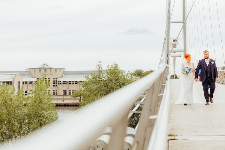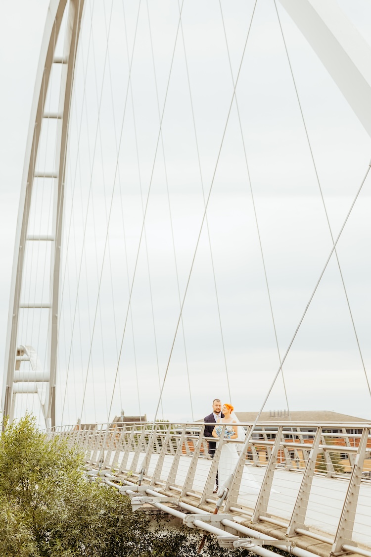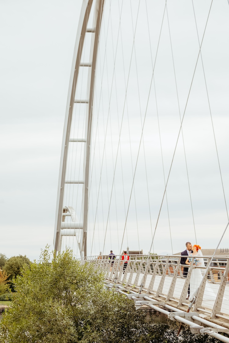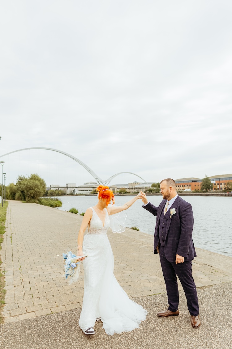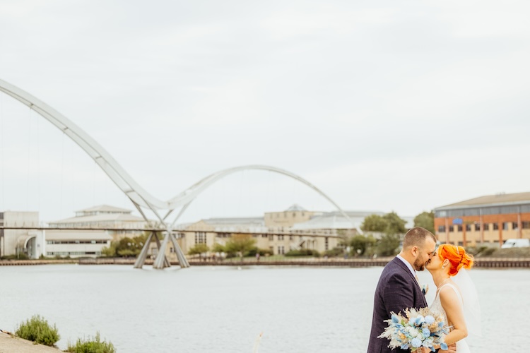 The River Tees provided a stunning backdrop for their portraits, with the Infinity Bridge arching elegantly behind them. Whether it was a romantic kiss by the water’s edge or a quiet moment together on the riverside walkway, every image reflected the couple’s connection and the unique setting of their day.