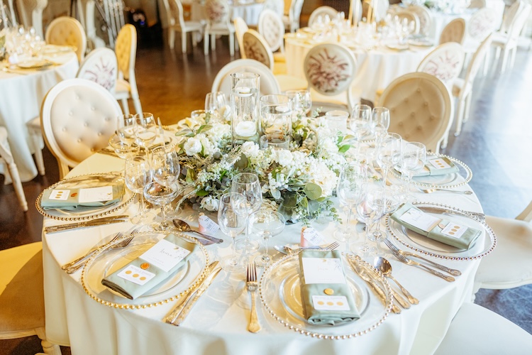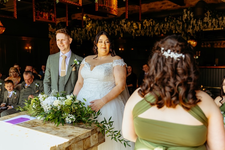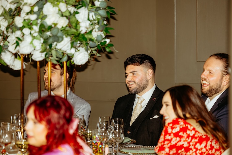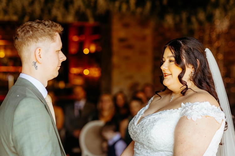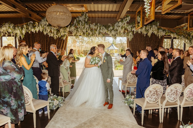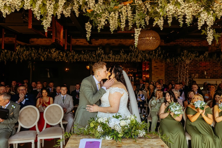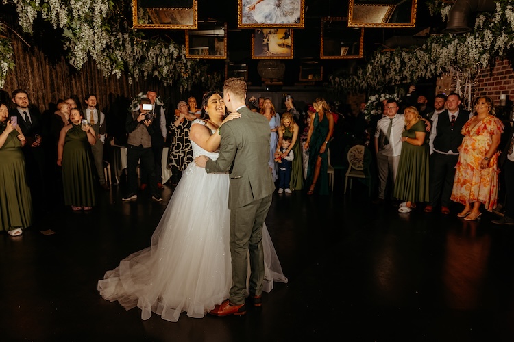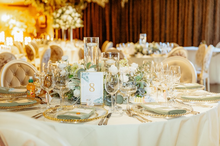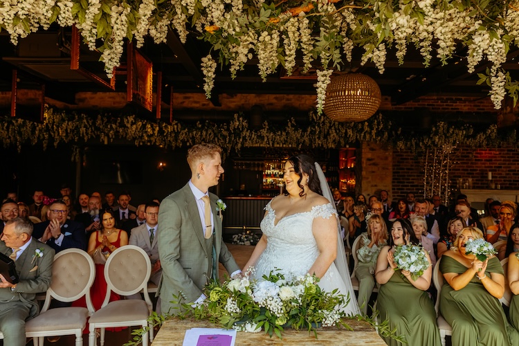 The day began with an emotional ceremony beneath a canopy of lush greenery and sparkling chandeliers. Surrounded by family and friends, Jennifer and Michael shared their vows and their first kiss as newlyweds, with the joy and excitement of their guests clearly shining through. The venue’s stylish ceremony space and beautiful natural light made every moment feel extra special.