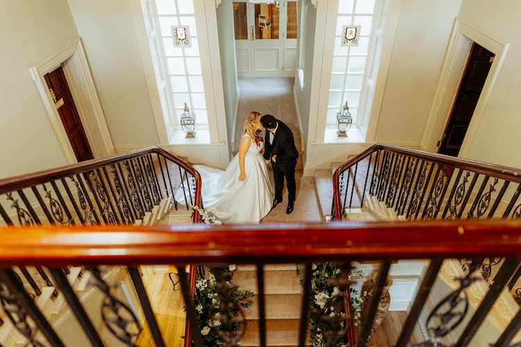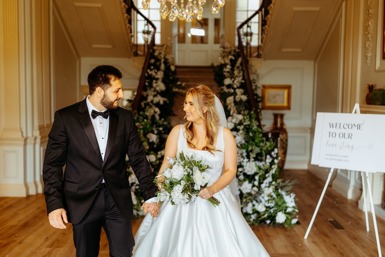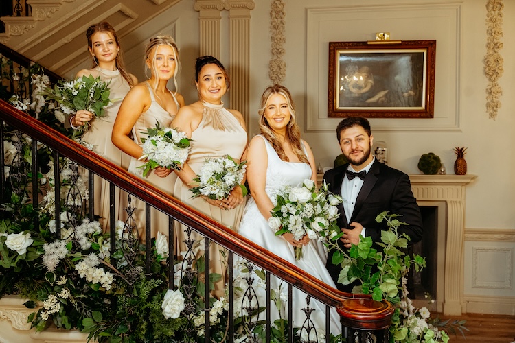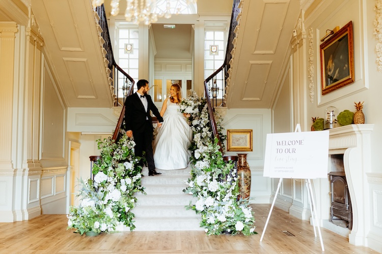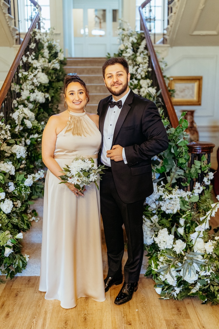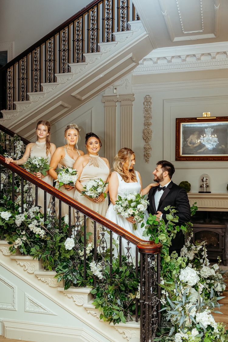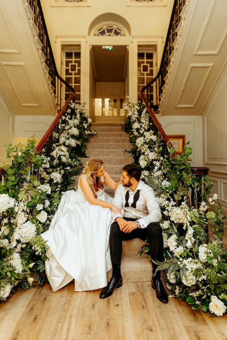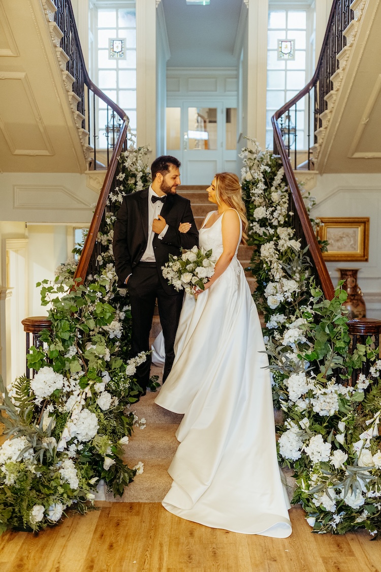 After the ceremony, the newlyweds made the most of Lemmington Hall’s iconic staircase, adorned with cascading white florals. Samantha looked radiant in her gown, and Mike couldn’t take his eyes off her as they shared a quiet moment together, captured in a romantic portrait at the heart of the Hall.