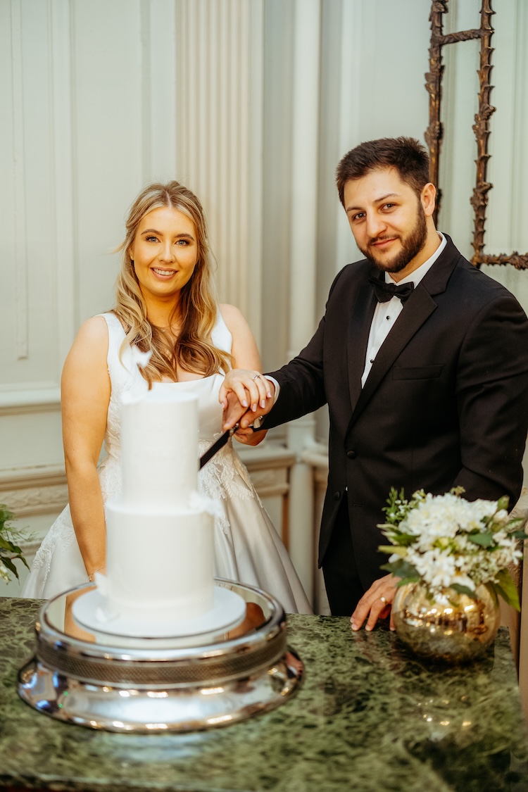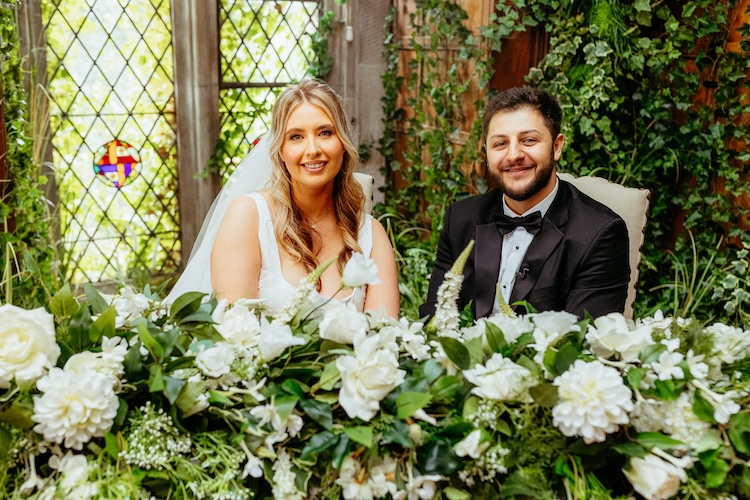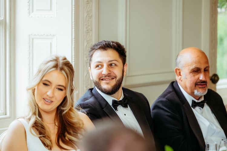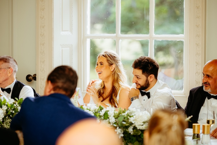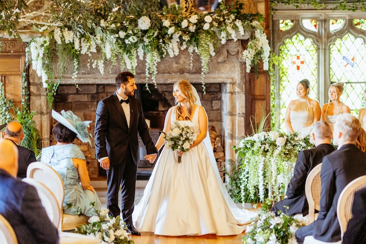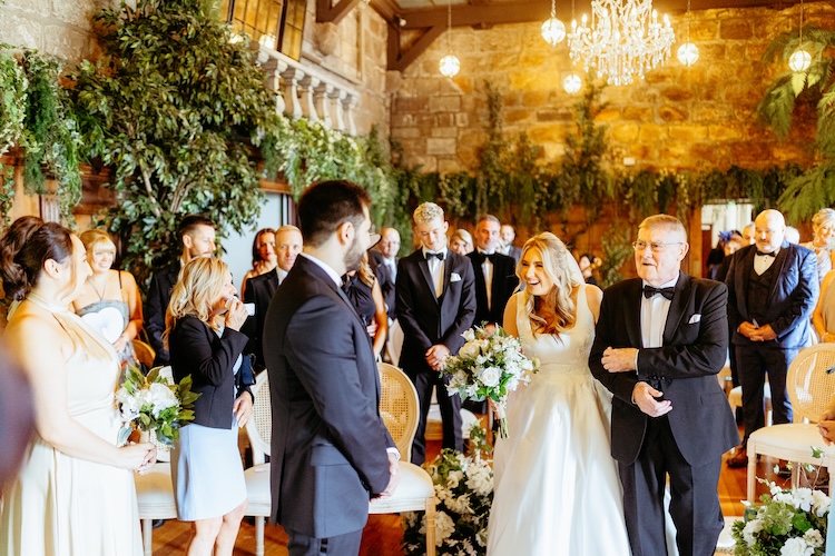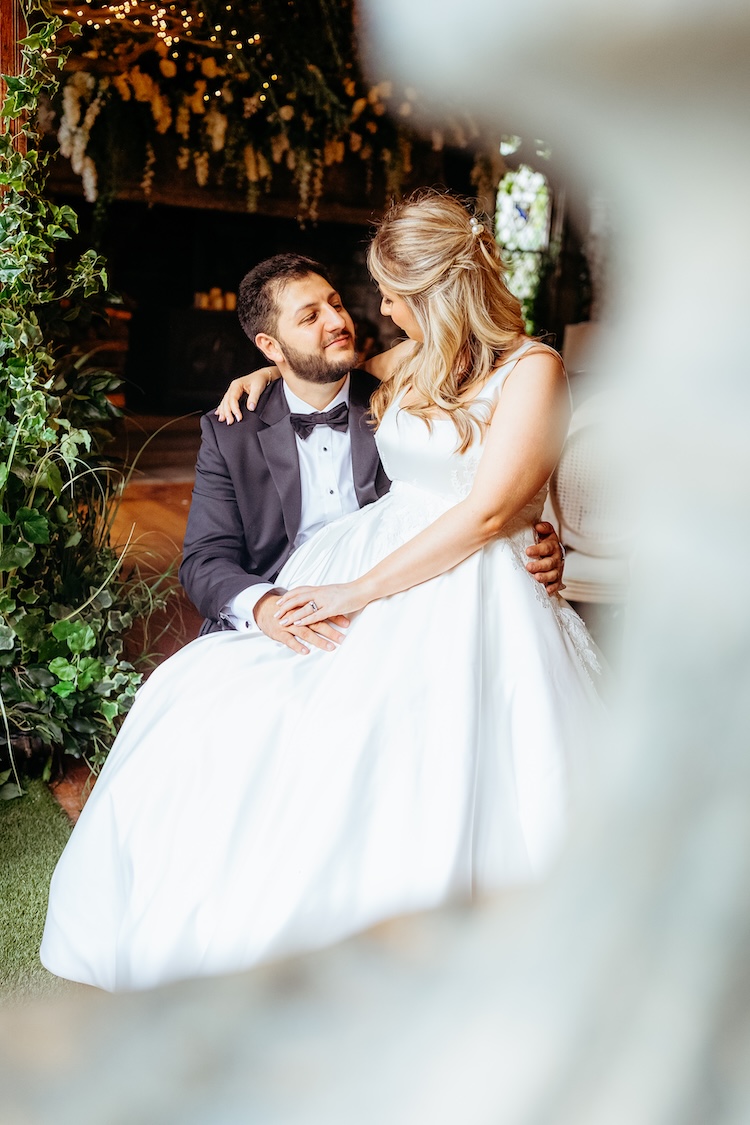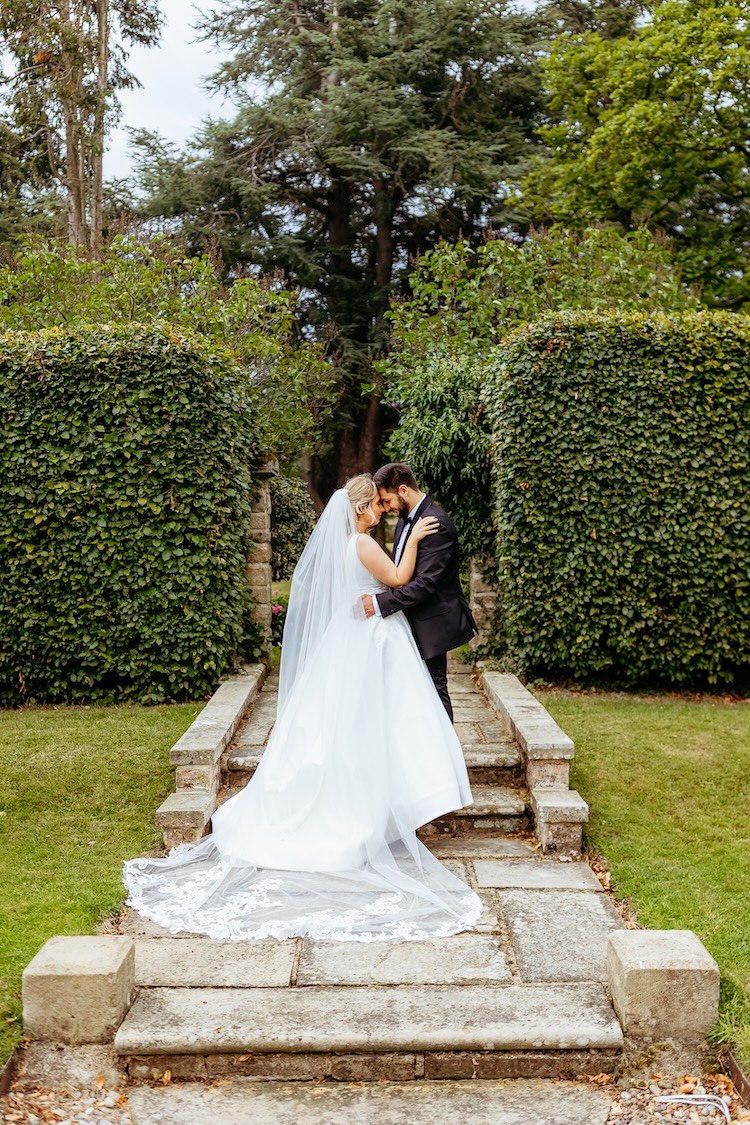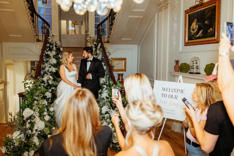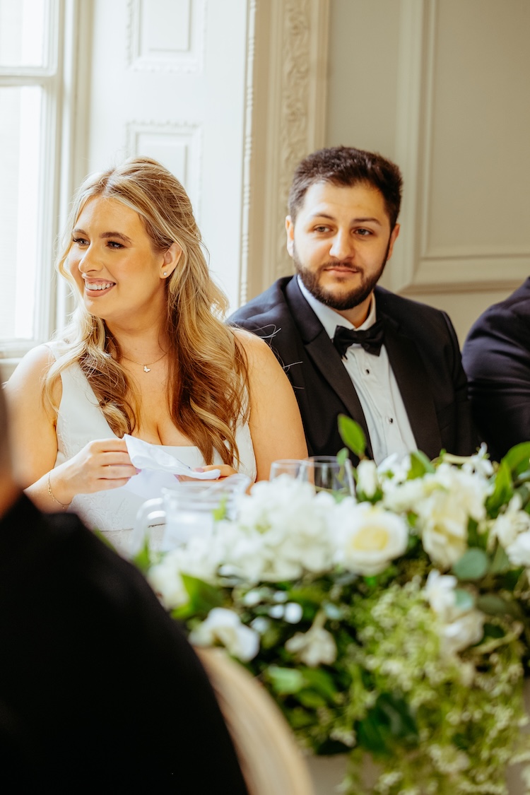 After the ceremony, the newlyweds made the most of Lemmington Hall’s iconic staircase, adorned with cascading white florals. Samantha looked radiant in her gown, and Mike couldn’t take his eyes off her as they shared a quiet moment together, captured in a romantic portrait at the heart of the Hall.