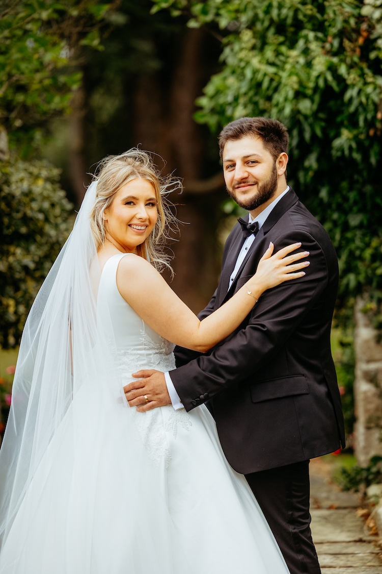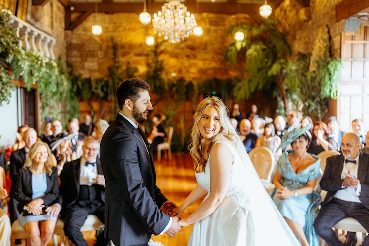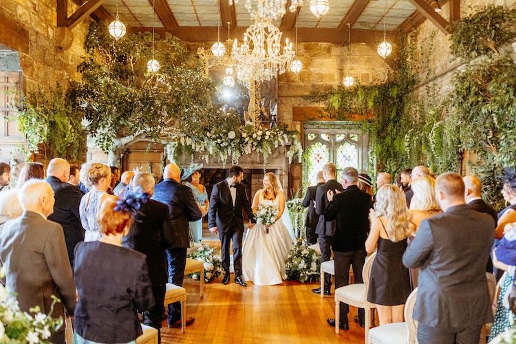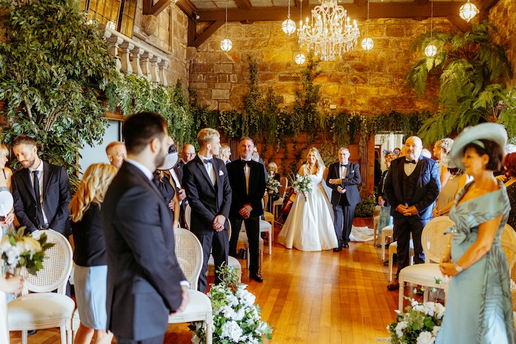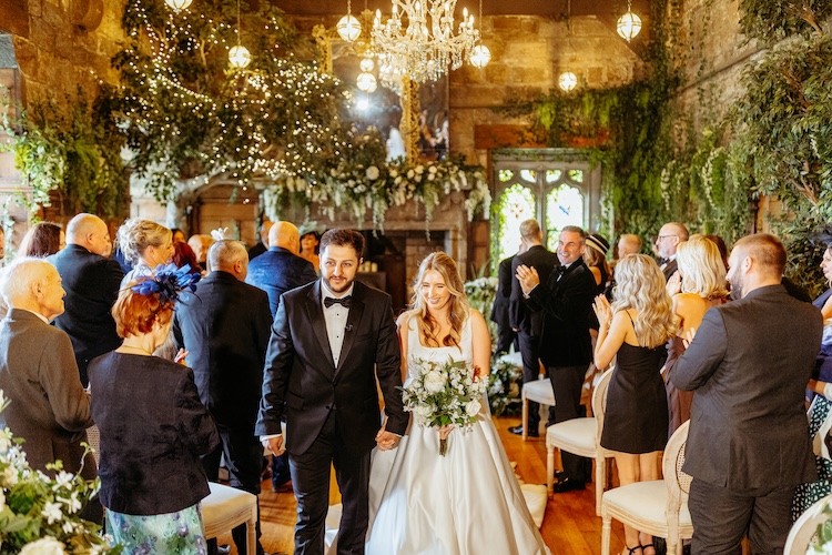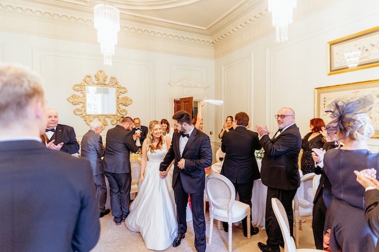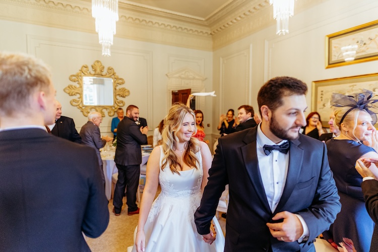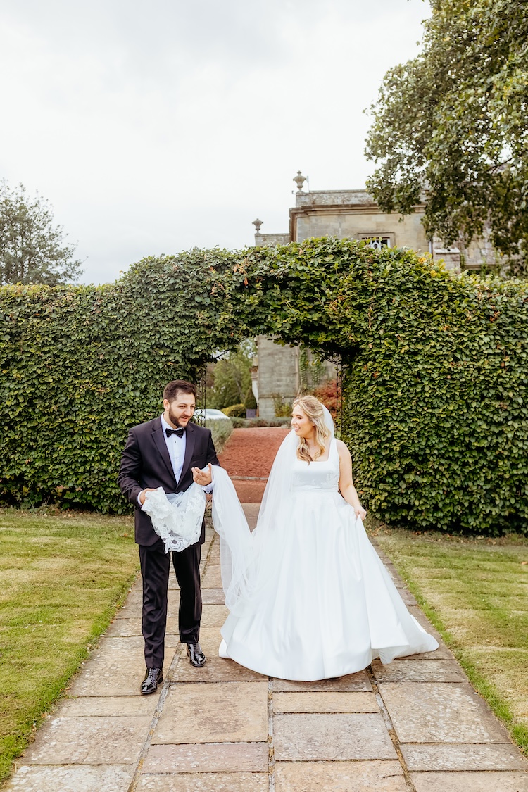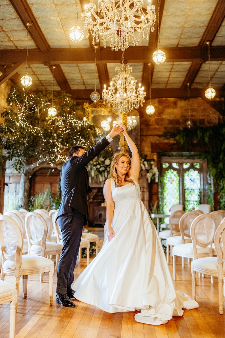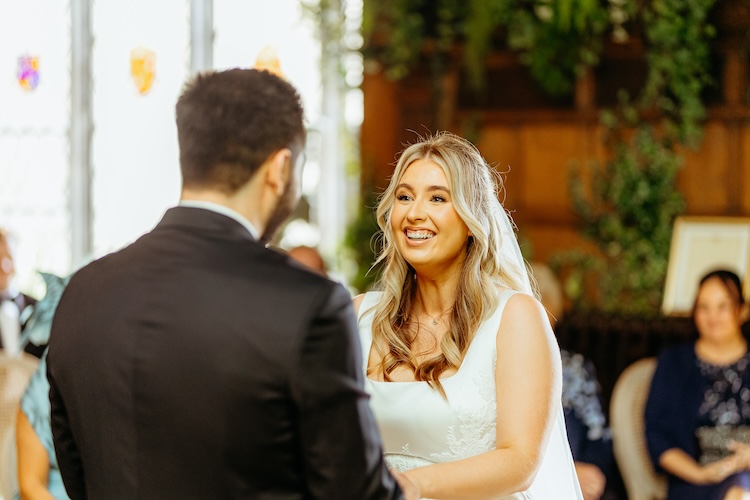 After the ceremony, the newlyweds made the most of Lemmington Hall’s iconic staircase, adorned with cascading white florals. Samantha looked radiant in her gown, and Mike couldn’t take his eyes off her as they shared a quiet moment together, captured in a romantic portrait at the heart of the Hall.