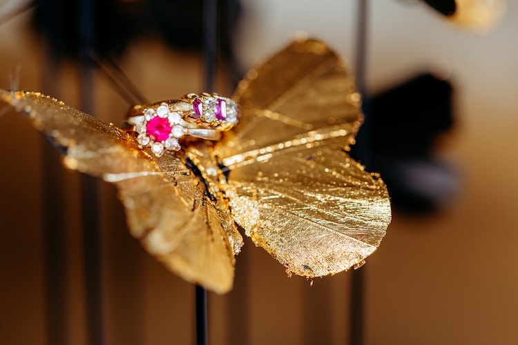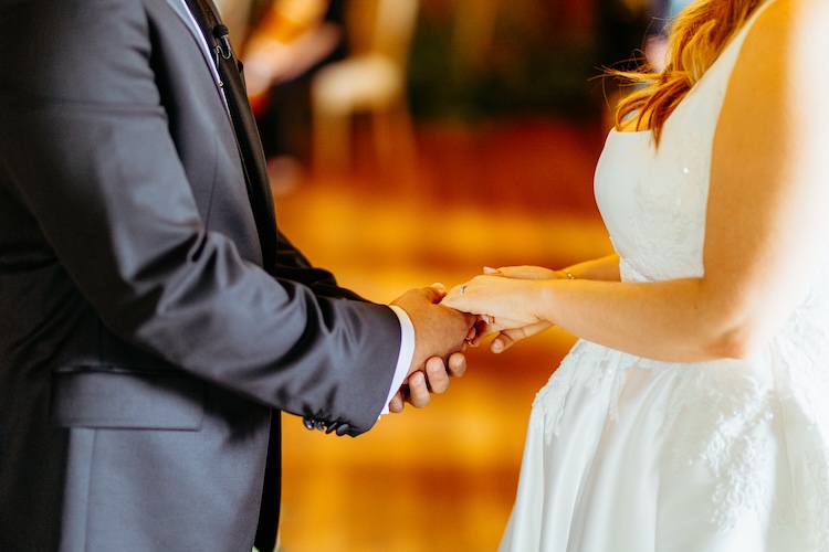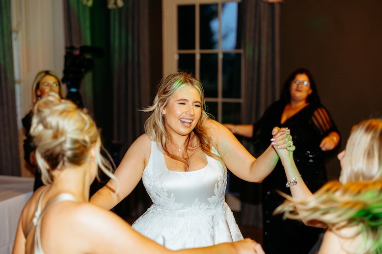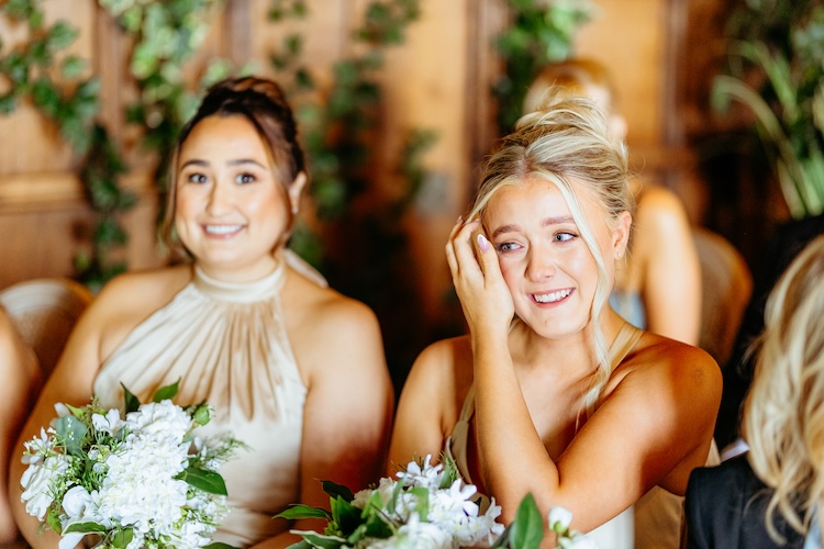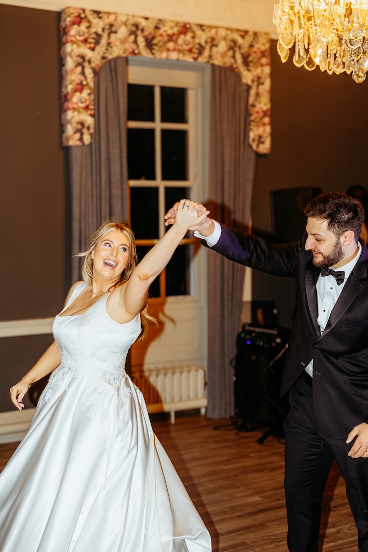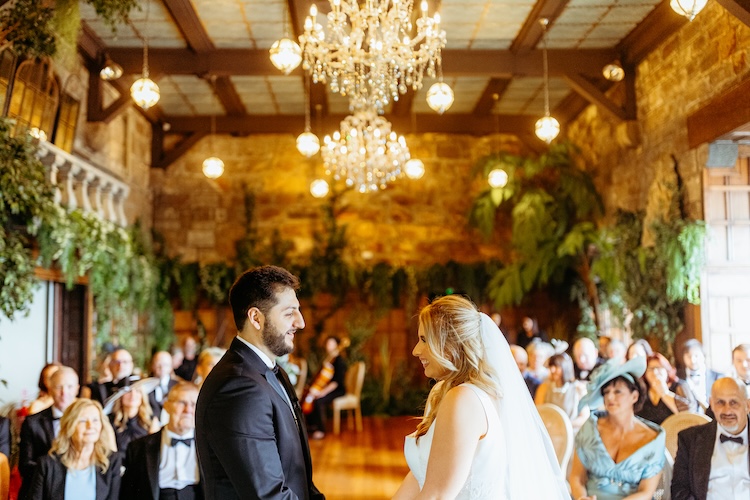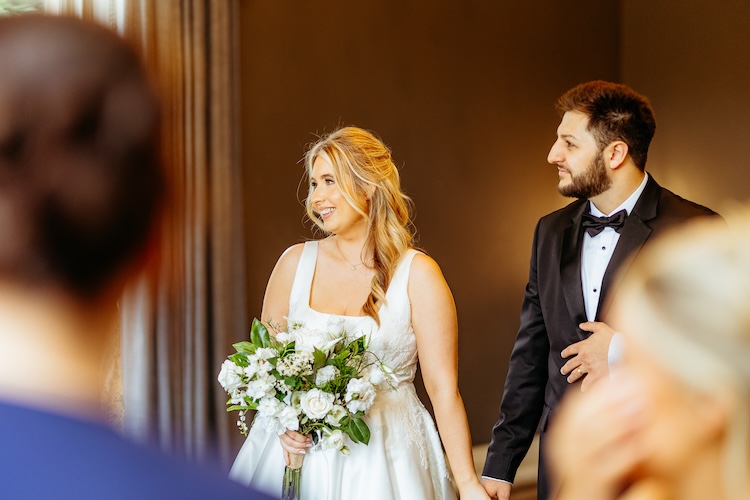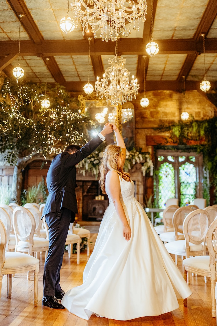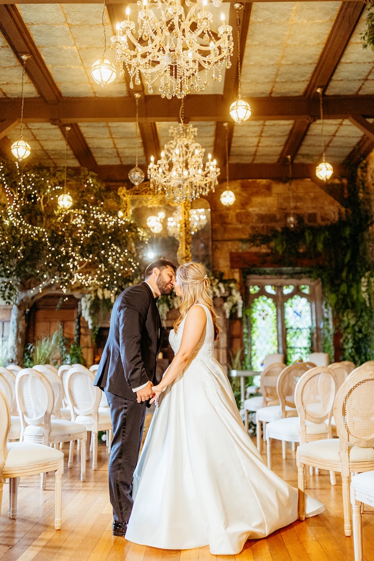 The celebration began in the Hall’s breathtaking ceremony room, where Samantha and Mike exchanged vows surrounded by family and friends. The warm stone walls, sparkling chandeliers, and lush foliage created an enchanting setting for their heartfelt promises, with smiles and happy tears all around.